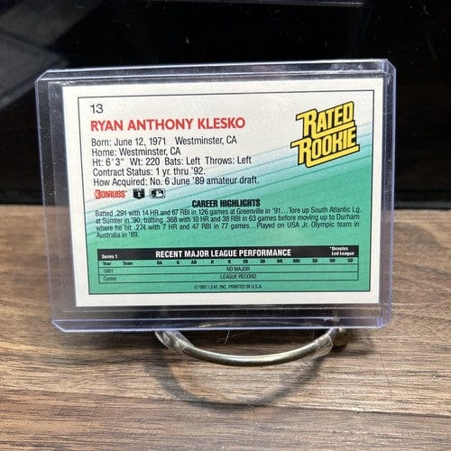 1992 Donruss Baseball. Ryan Klesko Rated Rookie #13. Atlanta Braves.
