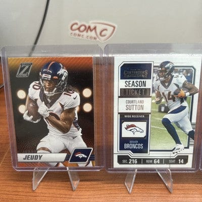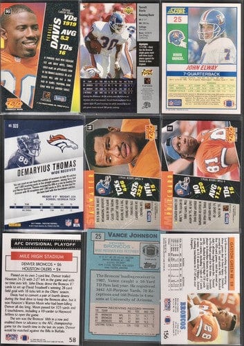 NFL Category Denver Broncos Football Trading Cards for sale cards we sale are all your top brands of Football Cards. Panini Prizm, Panini Zenith, Panini Select, Panini Contenders, Donruss, Donruss Optic Football, Donruss Elite. Topps, Pro Set, Topps cosmic , Fleer, Score, Upper Deck We carry all the top NFL Players Veteran and Rookie Cards refractors, Parallels , Prizms, Halo , Autographs, Relics, Patch Autos, Serial numbered Cards and many other choices of top NFL sports Cards. This page contains Lots and single Cards of Players card that play for the Denver Broncos of the National Football League.
