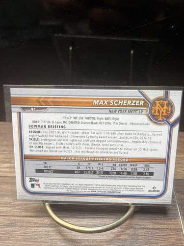 Max Scherzer 2022 Bowman Baseball Card #91 New York Mets