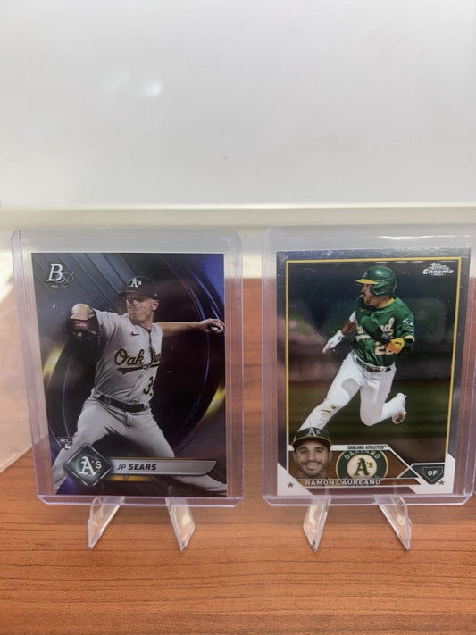 Oakland Athletics MLB Sports Trading Cards will be listed in this collection all the top Players present day and all of the HOF Players from different eras. We stock Topps ,Topps Heritage ,Topps Archives, Topps Gallery, Topps Tribute, Topps Chrome , Topps Chrome Cosmic, Bowmans Best , Bowman Platinum ,Bowman, Bowman Draft, Bowman Draft Chrome, Bowman Chrome Prospects, Panini Select, Panini Prizm, Donruss, Donruss Optic, Upper Deck, Fleer, Fleer Ultra, Score and Many more. You will also find Autographed Cards, Relics, Serial Numbered Cards such as 1/1 ,5,/10,/25,/50,/99,/150,/199,/250,/299,/499. And if you are looking for type of parallel color parallel we have the whole rainbow of selection. only Oakland Athletics players will be listed under this collection.