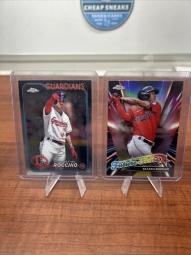This lot includes two Brayan Rocchio 2024 Topps Chrome Future Stars cards, #FS-20 and #113, both in standard card size and aluminum material. The cards are from the Major League (MLB) and are part of the 2024 Topps Chrome set. They are not autographed and are not from the Cleveland Guardians team, but feature the player in his Future Stars Chrome Lot.