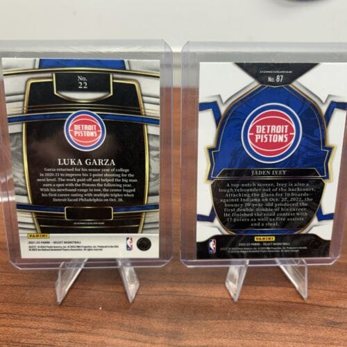 Get your hands on the ultimate Detroit Pistons rookie card lot, featuring all four standout players from the 2022-23 NBA season. This incredible lot includes Cade Cunningham, Jaden Ivey, Luka Garza, and Isaiah Livers, and each card is a Panini Select from either the 2021 or 2022 collection.