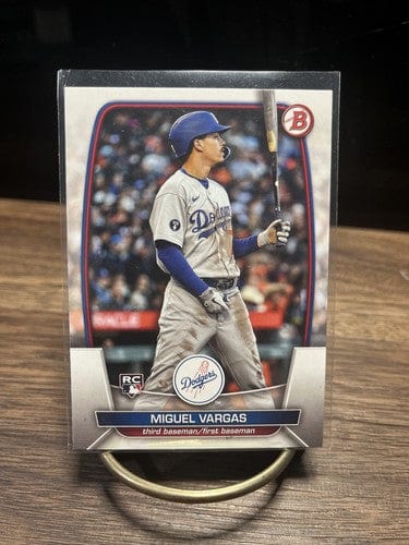 This sports trading card features Miguel Vargas, a player for the Los Angeles Dodgers in Major League Baseball. The card is a standard size and made of card stock. It is part of the 2023 Bowman set and is a rookie card, numbered 88. The card is in its original form, not a licensed reprint, and is in English.